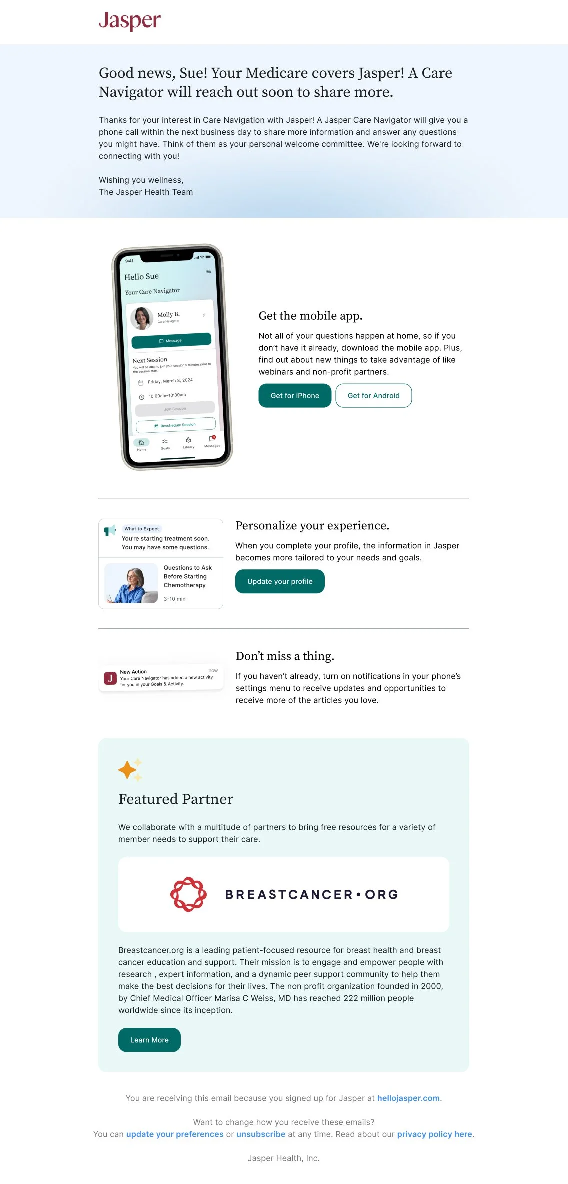 In addition to the meta ads shown above, I worked with a project manager to design and standardize all email templates. The one shown here is the first email a member will receive when they are eligible for Jasper’s services through Medicare. It utilizes a few key on-brand components that have been implemented into Braze.