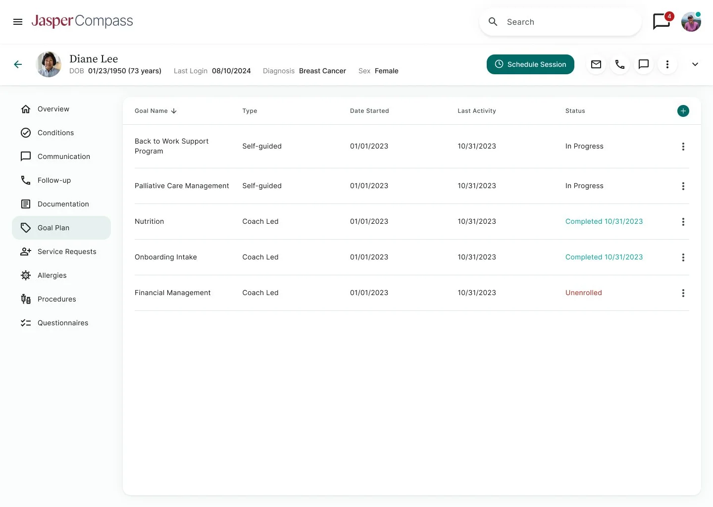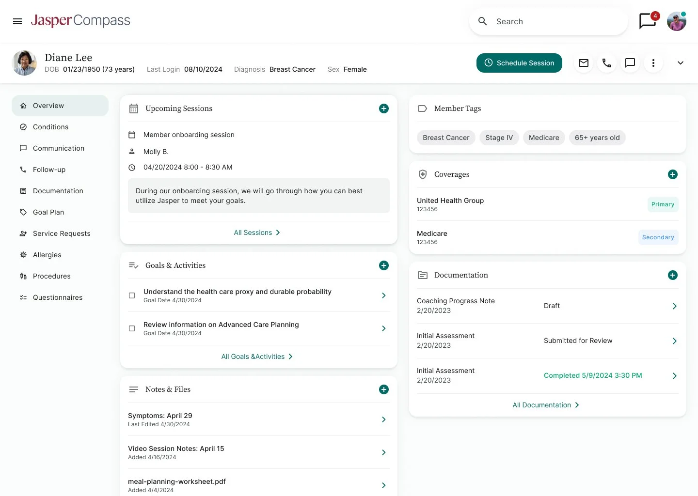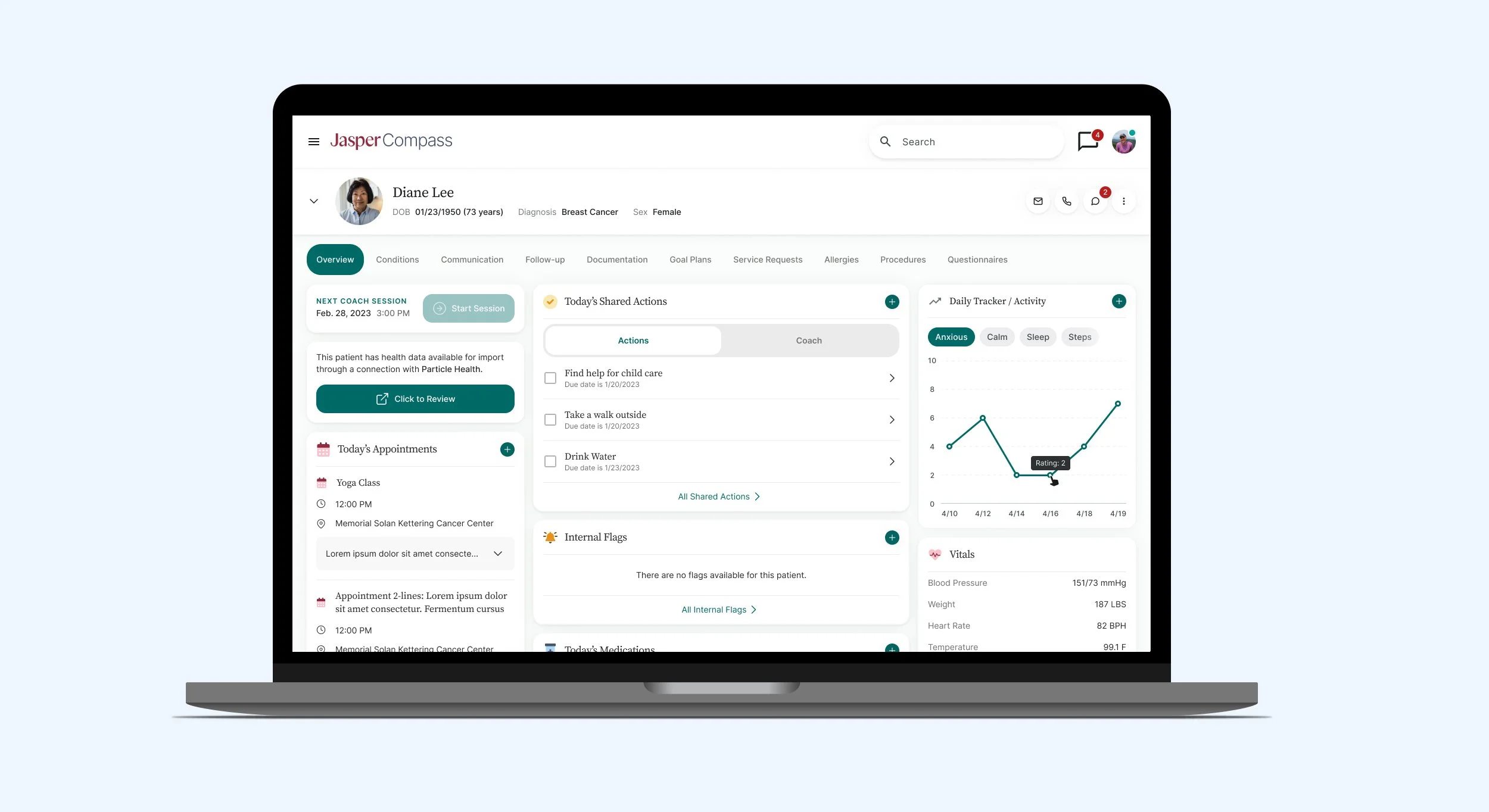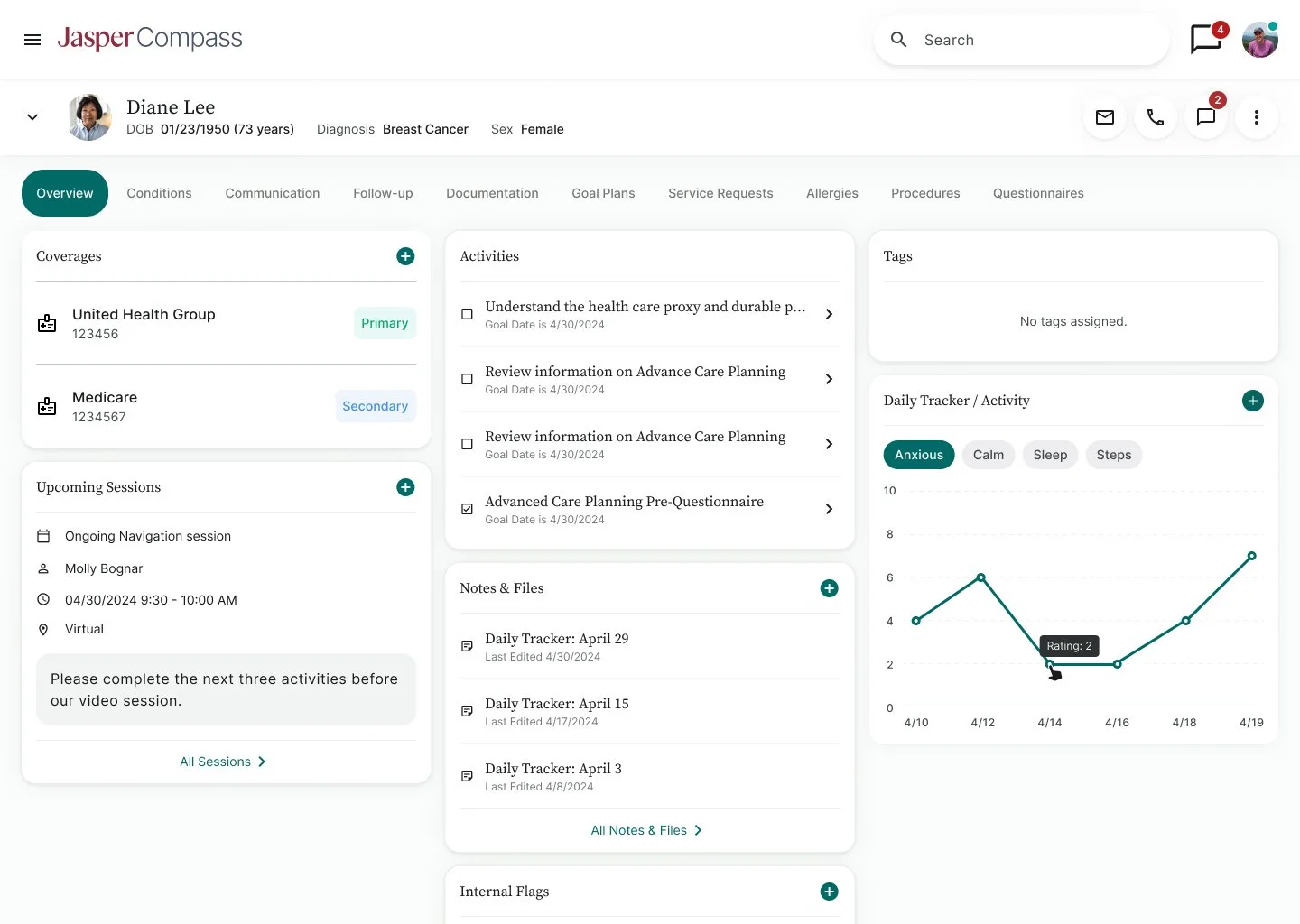 Jasper Compass is an AI enabled cancer care navigation solution used by care navigators and other supportive care professionals. Compass strives to support patient-centered, care and navigation by putting patient-reported outcomes, biometrics, and clinical data in actionable formats to prevent more work and burnout.